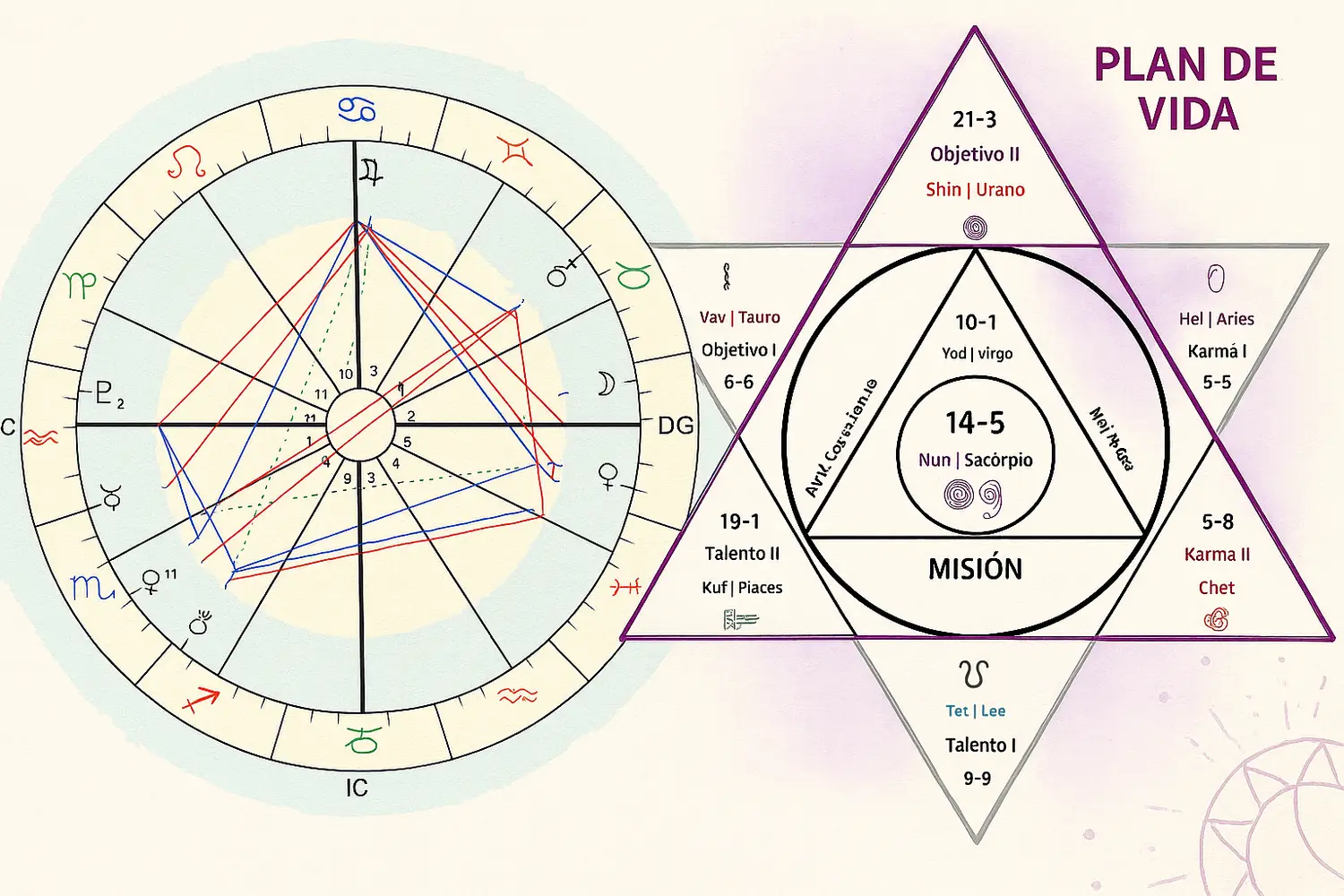 Cuando tu Plan de Vida y tu carta natal se unen, la claridad se expande. Es como situarte entre dos espejos que reflejan con certeza tu verdad más profunda, revelando no solo quién eres, sino también el camino de transformación y crecimiento que te espera.