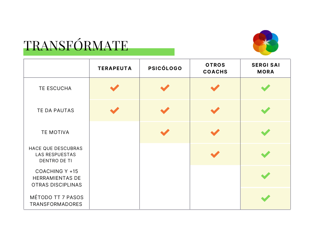 Enfocado a la transformación interior. Te enseño a pilotar o a transformar tu mente, tu corazón (es la 🗝️) y tu voluntad. Uso +15 herramientas distintas (entre ellas están "PLAN de VIDA", respiración integrativa, integración de sub-personalidades, quantum jumping, etc).